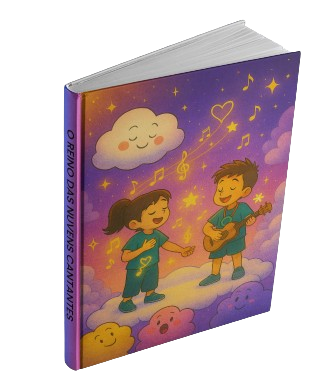 Luna e Ravi atravessaram a porta dourada e sentiram seus pés flutuarem. O chão havia sumido — agora estavam sobre nuvens fofinhas como algodão-doce. O céu era lilás, e notas musicais dançavam no ar como borboletas brilhantes…